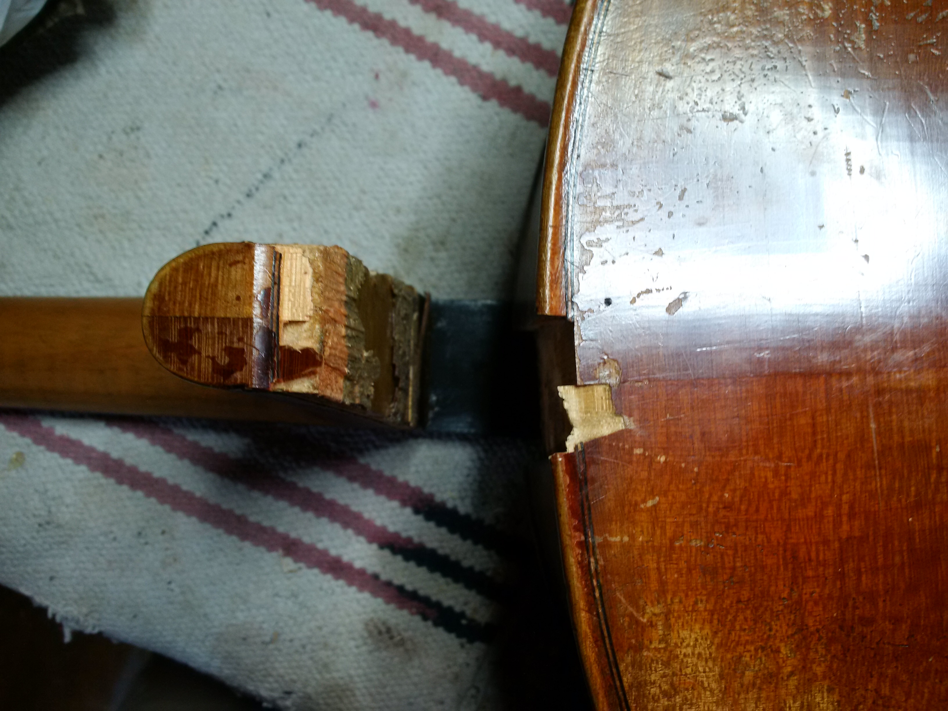 IMG_20151005_143849 Published December 15, 2015 at 3264 × 2448 in Cello Repair: Saving the original neck and button ← Previous Next → My first inspection of the break,